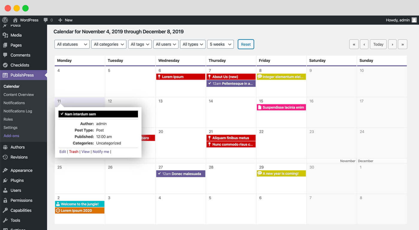 The Content Calendar gives you a powerful overview of your publishing schedule. This screen works as a marketing calendar and an editorial calendar. You can easily see when content is planned, and when it was published. You can also drag-and-drop content to a new publication date. By default, you see all the WordPress content you have planned for the next few weeks. If you need to drill down, you can filter the calendar by post status, categories, users or post types.