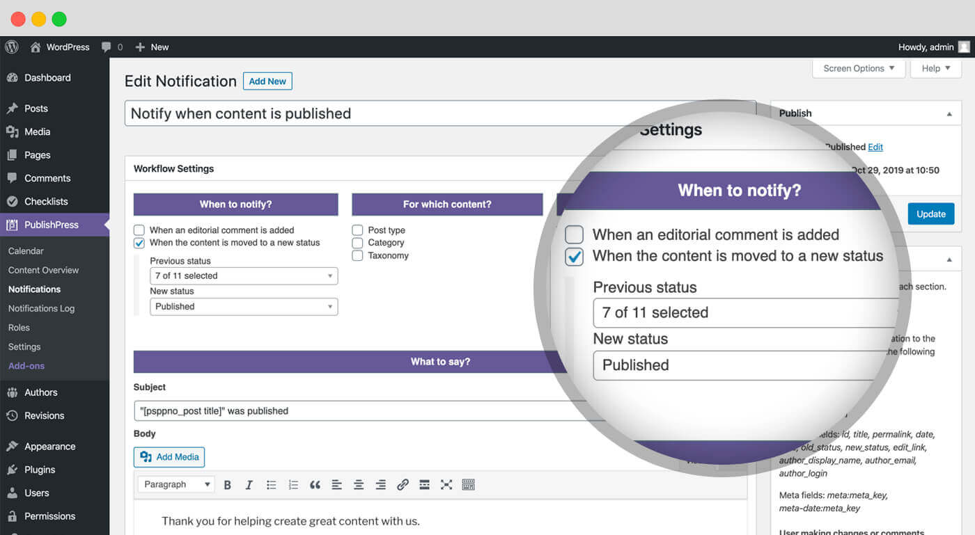 Notifications keep you and your team up to date on changes to important content. Users can be subscribed to notifications for any post, either individually or by selecting user groups. PublishPress Planner allows you to create powerful notification workflows based on post types, categories, status changes and much more.