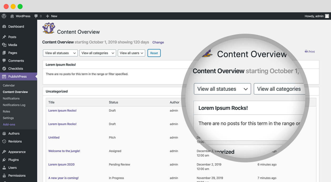 PublishPress Planner has all the tools you need to plan WordPress content including a Content Calendar, Content Overview, Kanban Board, content notifications, and more.