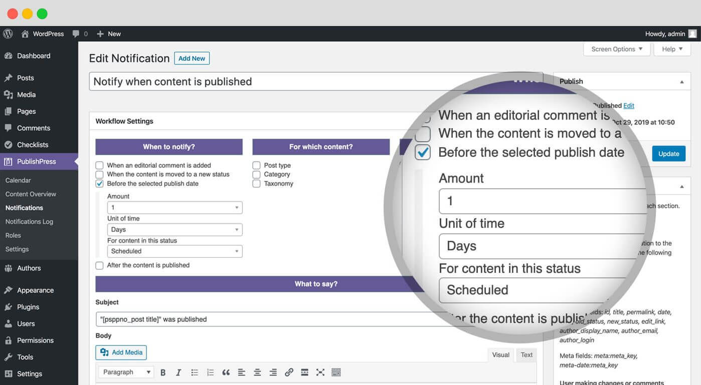This PublishPress Planner Pro feature allows you to send notifications either before or after the publishing date for content. For example, before publication, you can send a reminder to editors, asking them to proof-read the post for publication. Or two or three days after publication, you can send a reminder to various team members, asking them to promote the post on social media.